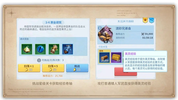 升级能提高英灵战力及带兵数量,战斗中英灵的血条用于反映带兵量的变化。击败地图上的普通矮人军团可以直接获得英灵经验;挑战时光之井中的星级关卡可获得英灵经验卷轴,需要在英灵升级面板上手动使用。