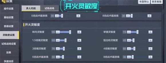 2、开火灵敏度:开镜瞄准下镜头的转动速度,练习的时候瞄准一个移动靶,能平稳地跟上目标即可,跟不上就调高灵敏度,每次在5-10数值之间调节,以下是开火调灵敏度: