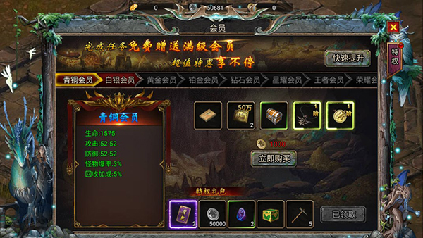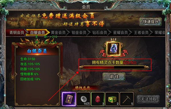 6、会员等级可通过打怪收集精灵点卡免费提升,会员等级越高,加成越高,礼包越丰厚,前期大家加油打怪吧。