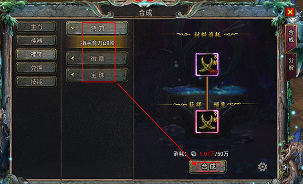 7、8阶及以后的猎手弯刀、拉兹姆斯宝珠、英雄徽章和27阶及以后的装备可进行合成,要记得留着哦。