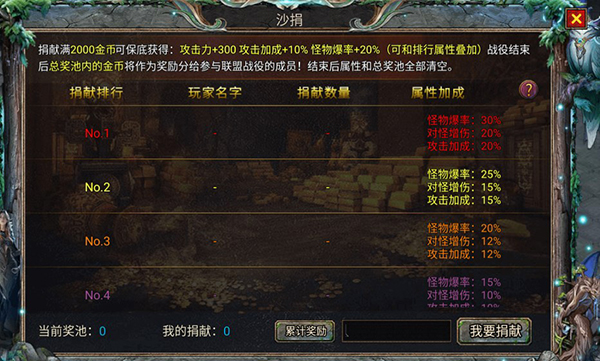 4、可拿2000金币去捐献榜捐献,不仅有高额的攻击加成更重要的是可提升打怪爆率,有什么能比打怪爆神装更爽快的事情呢。