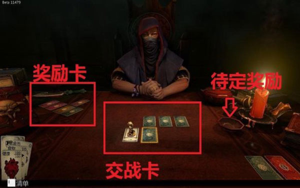 中心部分的卡牌构成了关卡流程,点击卡牌则进入遭遇事件。左下方则以卡牌形式显示人物的生命、食物、金币和装备。奖励卡则是完成战斗或者事件后抽取奖励或惩罚的卡组。待定的奖励则是遇到特殊事件时增加奖励的筹码,完成后才能获得。