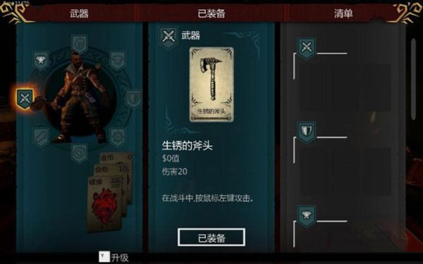 人物界面显示了人物的装备和物资情况,可以看到装备的详细信息以及清单列表。物资作用如下,金币:购买道具。食物:在卡牌间每次移动消耗食物,没有食物则会失败。健康:受到伤害会减少,为0则失败。