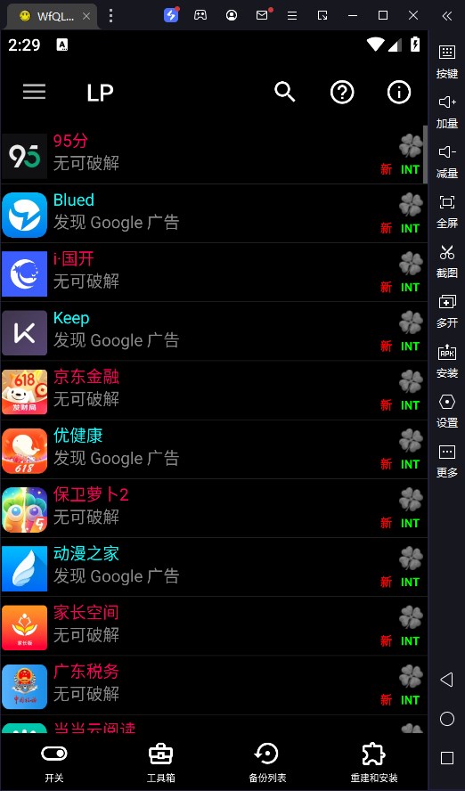17、支持筛选应用程序列表:按授权验证、Google广告、自定义破解、虚拟机缓存修复、未发现破解。