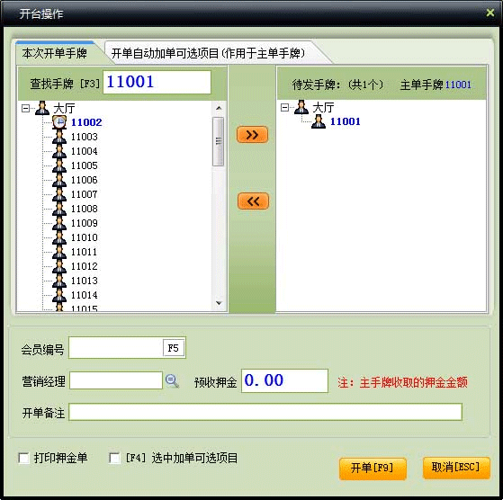 选中可供手牌 -> 单击开单 -> 输入押金、营销经理信息 -> 点击【开单】按钮完成开单操作,如图。