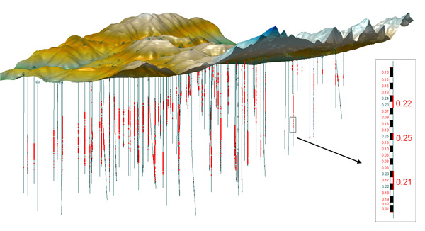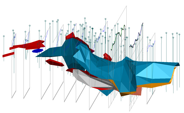地质工作应用中突出的特点是不仅可以通过数据库和三维地质模型对矿床进行空间分析和品位计算,而且对于所有的地质信息(如地质界线,工程位置和分析数据)的提取,不再是手工绘制来实现制图和计算,这将是地质工作的一项变革。