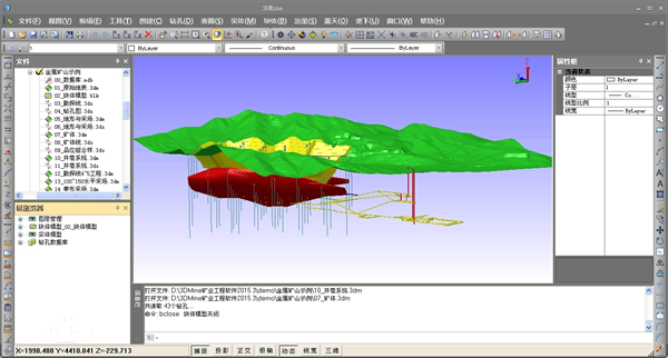 通过Excel将工程(探槽、坑道或坑道)编录的数据、物化探数据或水文数据和煤质数据按照规则的表格录入,并通过简单的步骤创建和存储在数据库(如Access)中。3DMine 三维矿山软件核心可以将数据库与中心图形系统紧密相联,通过菜单选择或者鼠标右键功能可以迅速的浏览钻孔据查询、矿岩界线(夹石)圈定和剖面品位计算。操作简单直观、错误信息即时呈现报告。可以通过不同属性的颜色设置显示单个或多个工程的地质岩性、品位、轨迹和深度等数据信息。在屏幕上可以选择容差范围内的数据按照标高生成平面或沿勘探线形成竖直剖面。
