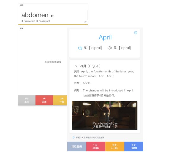 1)、单词关联视频中的图片和语音,联想记忆的同时熟悉单词的用法;