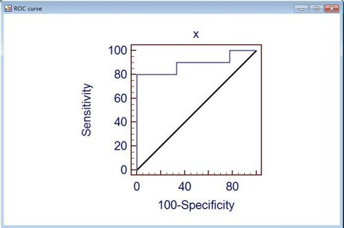 5、弹出的第一个界面就是ROC曲线。横坐标表示1-特异性,纵坐标表示灵敏度。