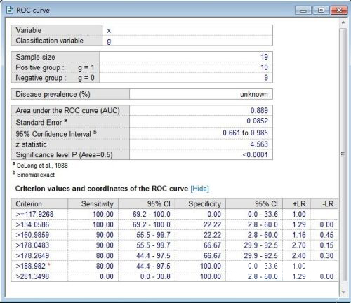 6、第二个界面是具体的参数信息,主要有曲线下面积(AUC)和灵敏度及特异性的百分比。