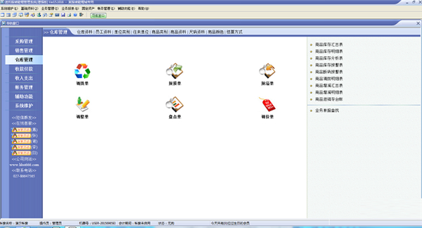 ◆基本功能 智能订货、进货入库、进货退回、销售出库、销售退货、报损、报溢、调入、调出、收款、付款、预收、预付、收入、支出、成本、利润及财务会计核算等。