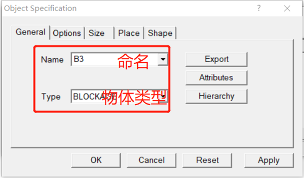 点击【general】选项卡,可以设置命名和物体类型(此处选择BLOCKAGE)。
