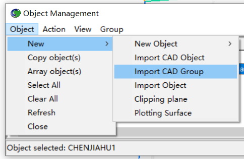 弹出Object管理菜单,选择Object—New,显示New Object(新建物体)、Import CAD Object(导入CAD文件)和Import CAD Group(导入CAD组件);