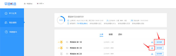3、进入录播课页面后,在想学习的课程后面点击“下载”或“看录播课”