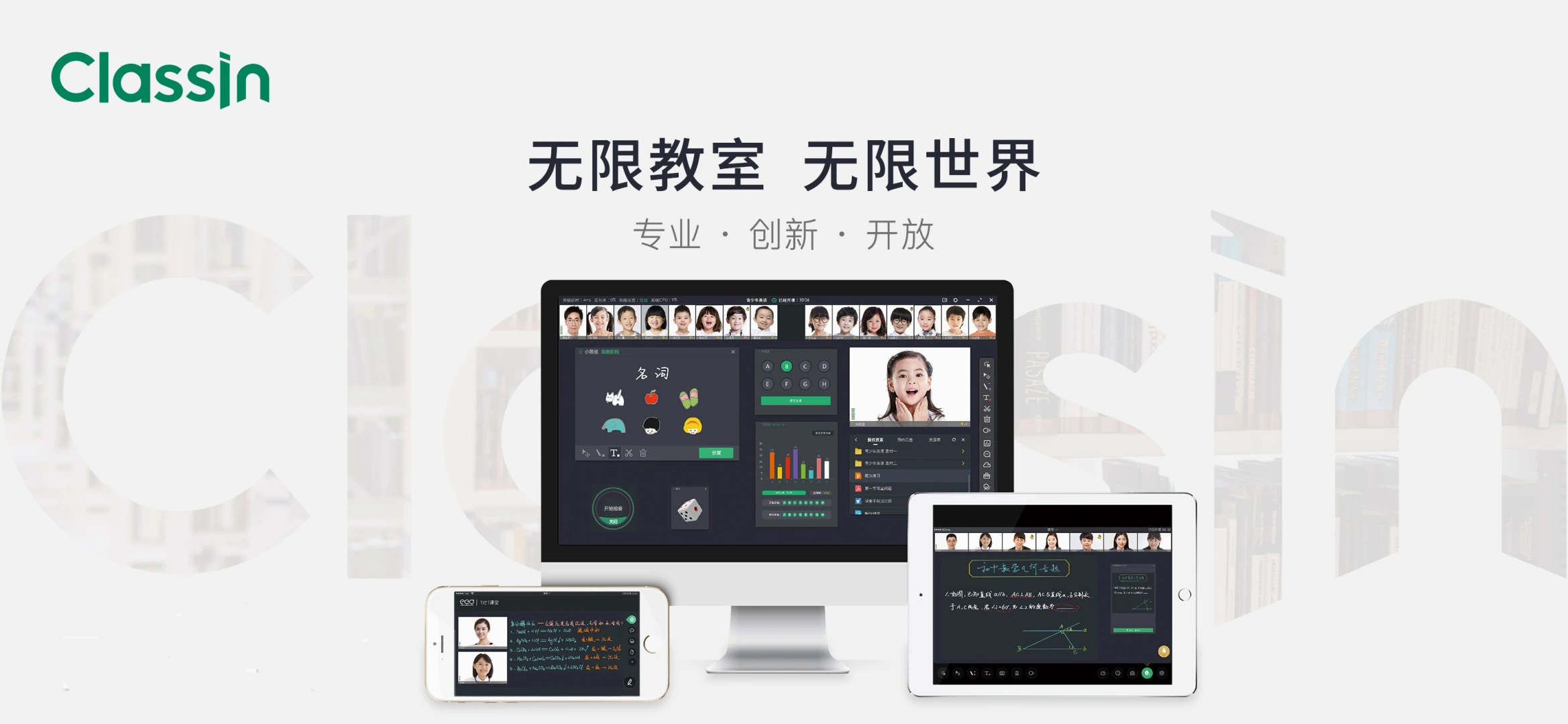 混合教学方案,可以支持线上直播教学、线下数字教学、多种混合教学(线上线下混合、课前课后混合教学、正式与非正式混合),最终实现智慧教学。ClassIn以卓越的线上直播教学而闻名,可以⽀持2000人在线、50⼈音视频显示,拥有多⼈协作⿊板、协作⽂档、分组教学、虚拟实验等上百种功能,让师生拥有媲美线下的教与学体验。