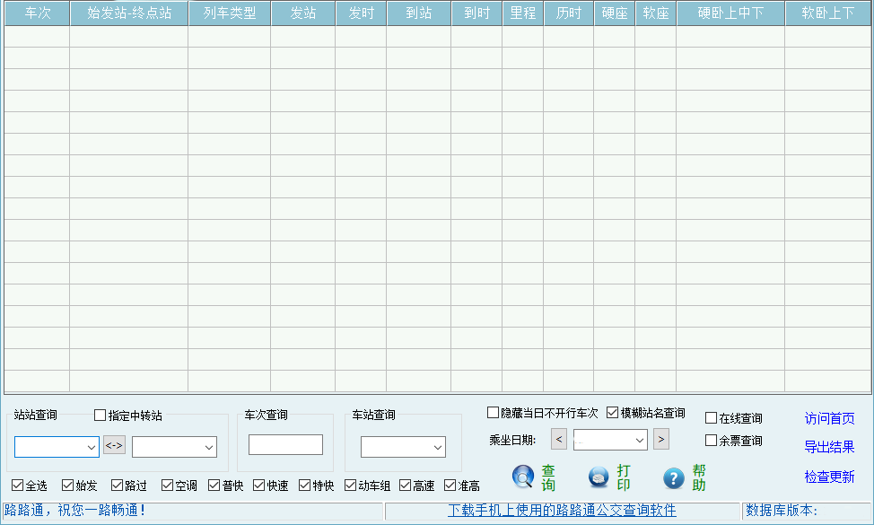软件使用软件本身带的数据库,(不用gprs和短信)不需要网络支持,免费版本是全部数据,有站站查询、车次查询、车站查询等功能。