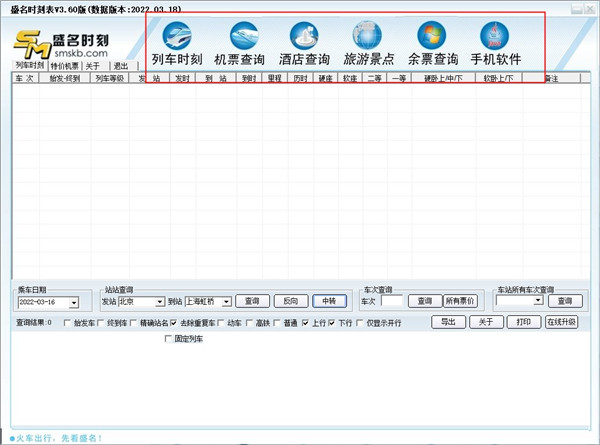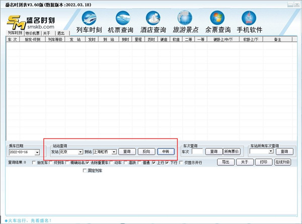 1、下载安装运行打开软件,在软件界面的下方你可以设置乘车日期,站点查询,比如北京到上海虹桥最后点击“查询”即可