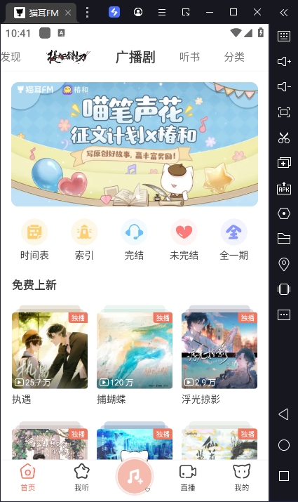 猫耳FM电脑版是借助安卓模拟器运行在pc端的一款音频播放软件。其集海量有声漫画、小说、音乐、广播剧、声优库以及铃声、游戏等多个精细版块内容供你选择。并且邀请了日知名CV、二次元、段子手、催眠等多位不同领域的知名大咖主播,为你在线朗读播放,猫耳FM致力于提供一个高音质音频和二次元资源阅读的优质收听平台。在这里用户根据自身兴趣随心所欲的免费畅听。无论是纯爱、悬疑、灵异、少女还是情感治愈都应有尽有,全方位满足你不同收听喜好。同时还内置了多种贴心化收听模式可任你随心切换。只为给你最纯净舒适的收听体验。