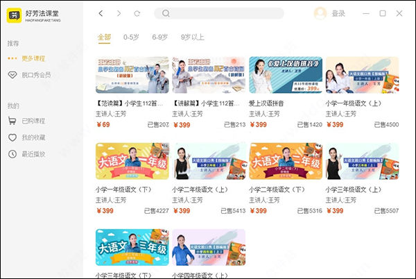 1、好芳法课堂界面如图所示,显示多种课程资源,可以在软件查看语文、数学。
