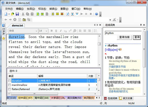 ⑤如果只分析选择部分的文本,请选择文本后,按菜单"生词->分析选择"