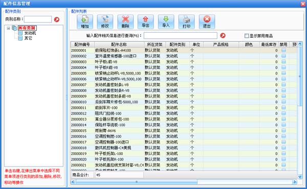 在配件信息窗口中左边是配件类别,右边列表中是该类别对应的配件。在某一类别上点击鼠标右键,可以新增类别,重命名和删除类别。新增的类别是属于所选类别的下一级,如果类别下有配件存在则该类别是不能被删除的。在类别名称后的文本框中可以输入类别名称或类别简码来查询需要的类别。如果要修改配件,先选中要修改的配件,点击“修改”按钮打开配件修改界面,在配件修改界面中修改相应的信息点击“保存”即可。点击“删除”按钮即可以把选中的配件删除,该配件发生过业务则是不能删除的。