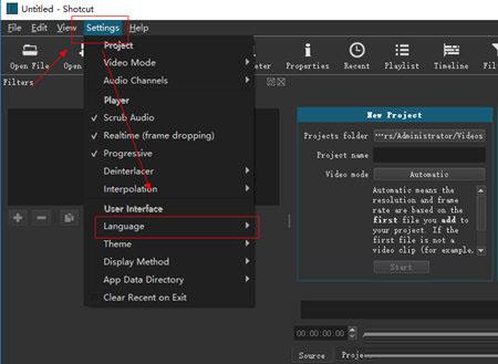 1、首先,打开Shotcut的主页面,选择点击”Settings“,该选项为设置选项,在下拉框中找到”Language“。