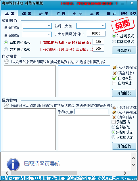 1.增加游戏掉线后自动关闭计算机的功能,可自设掉线后延时多久自动关机 并且在这段时间内可以手动取消关机2.增加帮主自动交灵气的功能