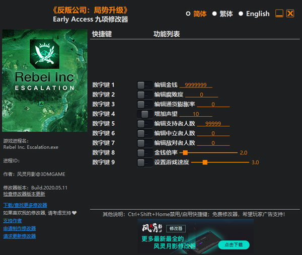 反叛公司局势升级修改器是由风灵月影大神针对政治/军事策略模拟游戏“反叛公司:局势升级(Rebel Inc:Escalation)”原创制作的一款游戏修改器。能给玩家提供编辑金钱、编辑腐败度、编辑通货膨胀率等九项游戏内数据修改功能,能够大大的降低游戏难度,觉得反叛公司难的玩家可以下载使用哦!