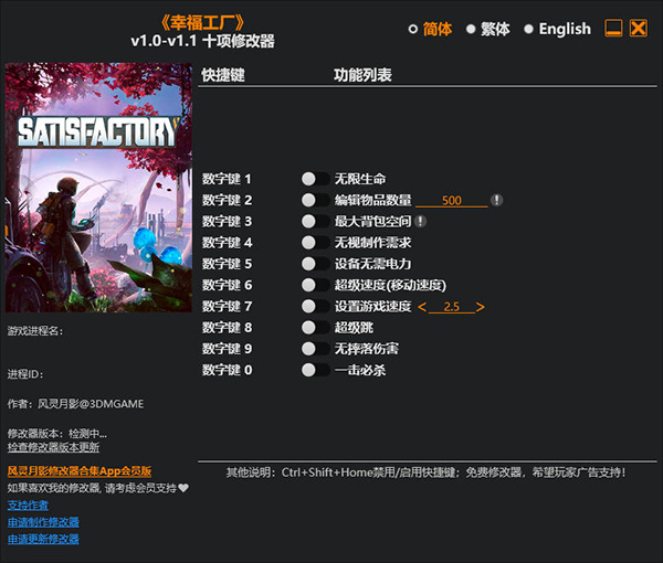 幸福工厂修改器是一款专为模拟经营类游戏《幸福工厂》所打造的多功能修改器,通过它可以修改游戏各项属性,如限生命、无限物品、最大背包空间、无视制作需求、设备无需电力等十项游戏属性,从而提升你的游戏体验。