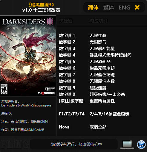 暗黑血统3修改器是一款专为动作冒险游戏《暗黑血统3》所打造的多功能修改器,修改器可以改变游戏的数值,如无限生命、无限暴乱能量、超级速度、无限蓝色窃魂等功能,且修改器简单易用,玩家只需启动游戏、开启修改器即可进行修改!