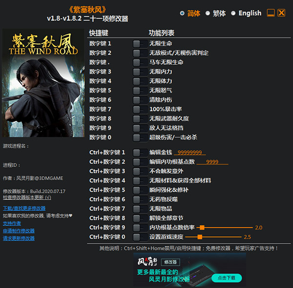 3、接着就是运行紫塞秋风风灵月影修改器,按照上面的按键功能,就是相对应的功能;