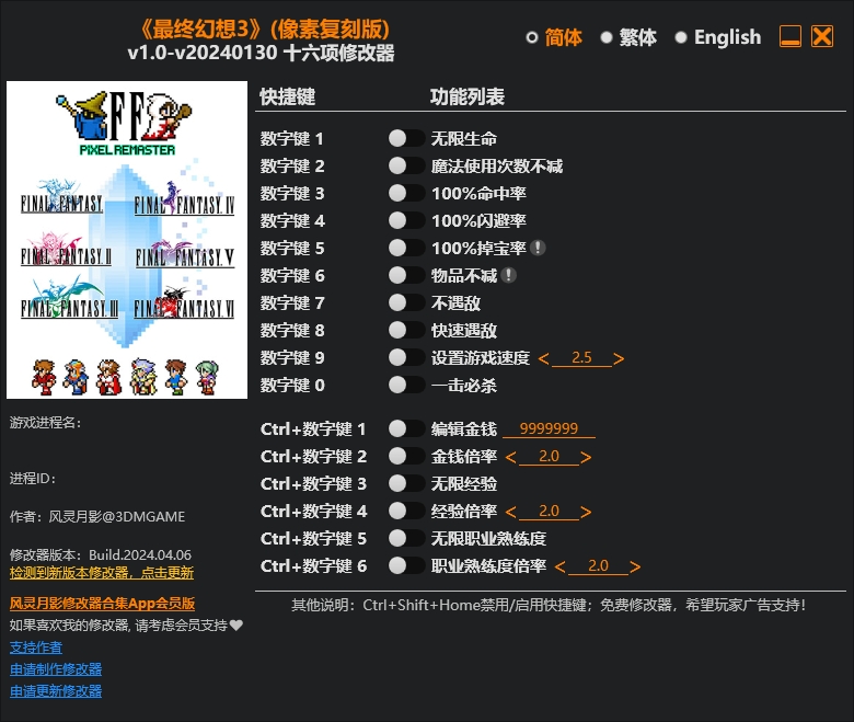 3、接着就是了最终幻想3复刻版修改器,按照上面的按键功能,就是相对应的功能;