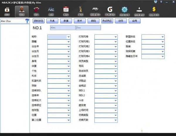 9、球员某些属性有关联性,比如球员自建昵称,常规球员这个昵称是无效的;另外MC模式下貌似不能正常念出MC的姓名,只有偶尔会念有相应声音的姓名;10、球员赛季数据中“-1”表示无对应数据,其他表示对应相应的数据。一般情况下不推荐修改,待以后有机会完善更多数据的修改;