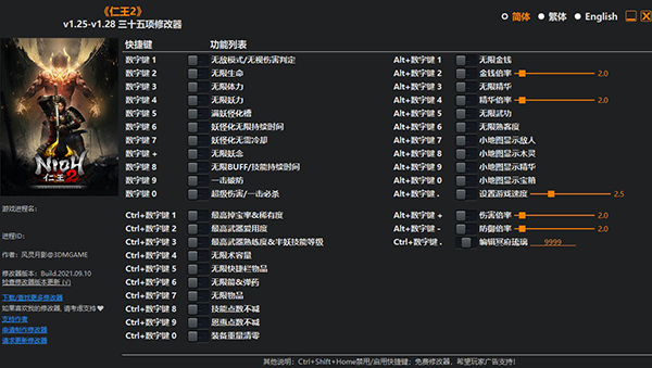 5、启动运行,如图所示,启动游戏后,开启修改器,并使用对应的快捷键即可实现对应功能的修改,或者你也可以直接在这里手动滑动开启。另外,这里还有简体、繁体和English三种语言选项(在右上角)。