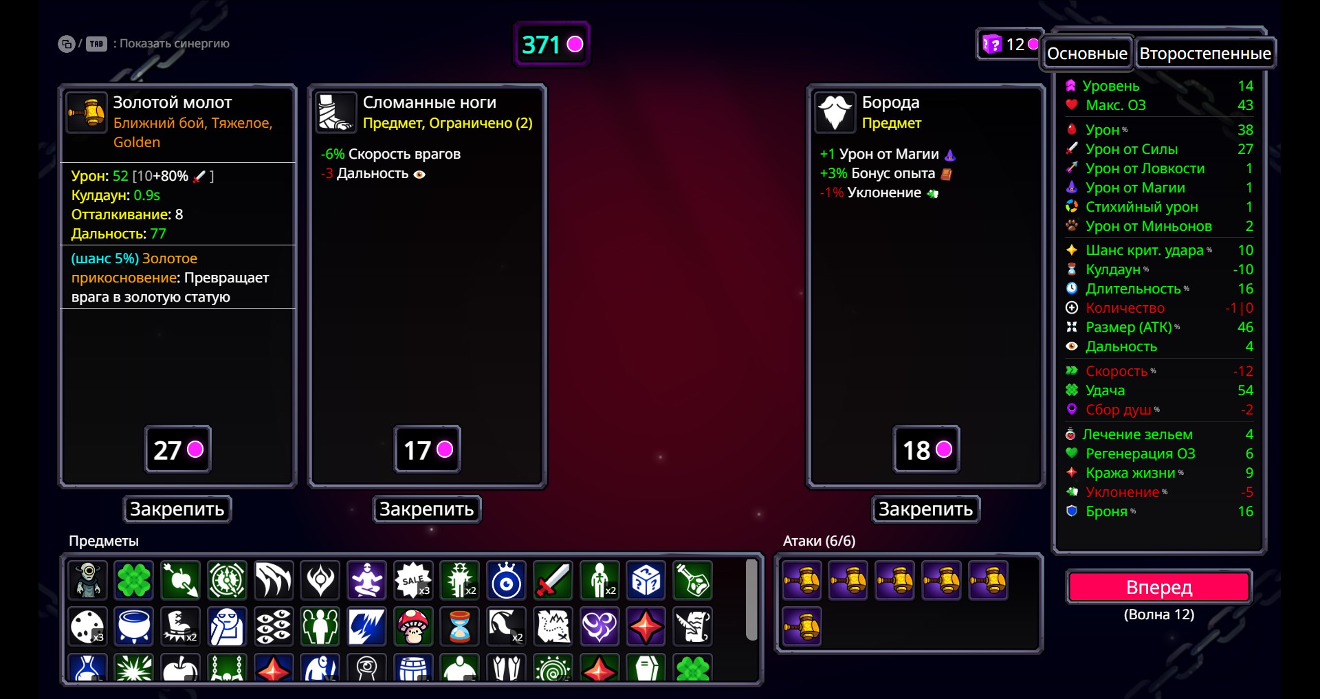 起手选溜溜球,主堆敏捷、生命偷取、伤害和幸运值,逐步收集以敏捷为主属性的武器。