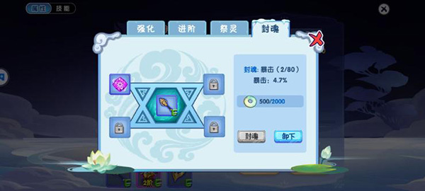 (4)封魂,相当于化身装备的启灵珠,通过各种渠道获得封魂印,目前一个装备上只能放一个封魂印,消耗一定数量的“华玉”进行封魂,可以提升封魂印的属性。每次封魂后消耗的“华玉”数量会相应增加。