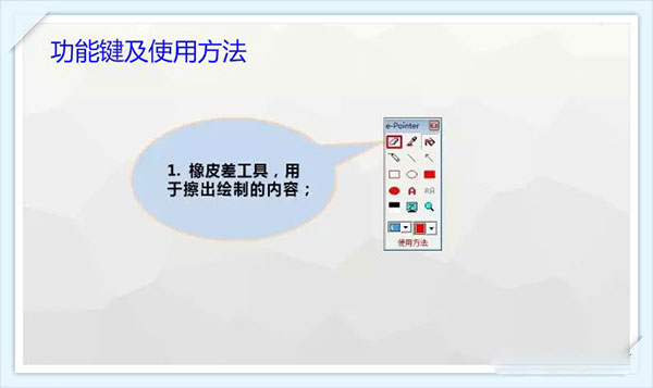 E-Pointer又名红烛电子教鞭,这是一款功能强大的屏幕教学软件,也可以说它是一款电脑黑板软件。运行这红烛电子教鞭后您可以随便在电脑屏幕上写字和画画,可用于教学演示,产品展示等多种常见用途。软件使用方便,一般用于教师课程PPT授课或者企业培训,线上会议时使用,能让您的鼠标在课件上进行标注操作,让演讲更加便利。红烛电子教鞭只有几十kb的大小,可以放在U盘上随身携带使用。它允许用户在电脑屏幕上随意写字、划线、白板、黑板、放大、缩小等多种操作,从而方便远程教学。红烛电子教鞭和windows画图的工具栏差不多,上手简单。有需要的用户可以下载体验!