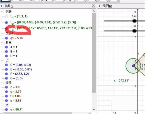2、输入后按回车键,生成三个数字滑动条变量,可以在代数区得到列表L1,其中有三个数字;