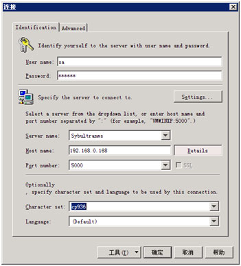4、在上图中,在Server name列表中选择将要连接的Sybase ASE数据库,下面的Host name和Port number对应的是服务器条目的信息。User name和Password分别输入登录Sybase ASE数据库的登录账号和密码。在Character set列表中选择字符集为:cp936