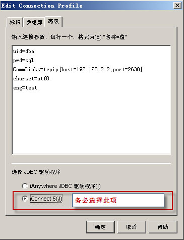 一定要选择JDBC驱动程序为: jConnect5,其中:uid,pwd,CommLinks,charset,eng分别表示用户名、密码、iq服务器ip地址和端口、字符集、数据库服务器名称。