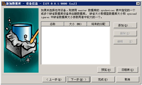 4、在上面的"设备信息"窗口中为数据库Demo分配数据设备和日志设备。点 添加 按钮,在弹出的小窗口"设备大小"中
