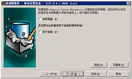 9、使用覆盖 和 用于装载 这两个选项都不要选择。使用覆盖选项只有在数据段和日志段都分配到同一个数据库设备的情况下才必须选中。用于装载选项能够提高数据库的创建速度,但是创建数据库完成后必须首先恢复数据库(load database)才能使用数据库。