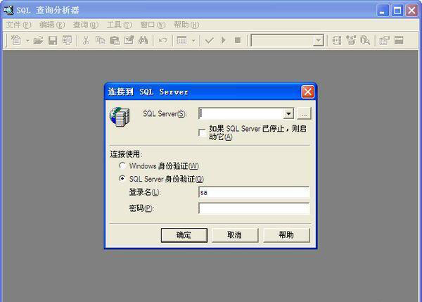 打开“开始->程序->Microsoft Sql Server->查询分析器”,弹出查询分析器连接配置对话框。在连接到SQL Server对话框的“SQL Server(S)”中输入服务器名称(注意:如果是本机可以用空或一个点表示),也可以点击后边的小按钮进行选择。连接使用如果是本机可以选择Windows身份验证,也可以选择SQL Server身份验证,如果不是本机最好选择SQL Server身份验证方式,然后在登录名中输入“sa”,密码输入SQL Server的登录密码(默认为空),点击“确定”连接服务器。1、首先要先确认有没有打开sql服务,即任务栏右下角有没有那个SQL图标。没打开的话自然登不上去,在程序中点击服务管理器,输入lacal或者.开始服务。