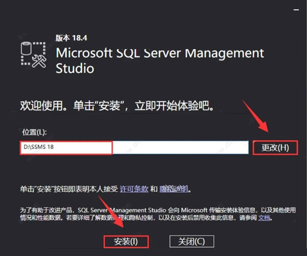 17、在软件的安装路径选择界面中,直接单击更改,即可更改软件的安装目录,建议安装在除C盘之外的其它磁盘,可以在D盘或其它剩余容量较多的盘符内,新建一个SSMS 18文件夹,然后再直接单击【安装】