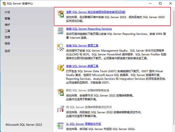 6、选择全新SQL Server独立安装或向现有安装添加功能;