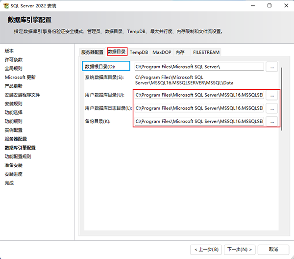 15、数据目录,这里可以更改用户数据库文件的默认位置,可以保持默认,建议单独建立目录进行分配;