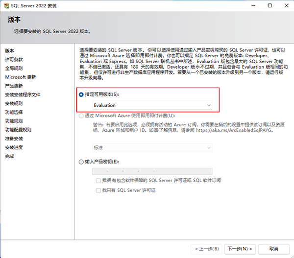 7、选择安装版本Evaluation(试用版),developer(开发者版)(差异见下图)(这里如果有产品密匙可选择输入产品密匙),点击下一步;