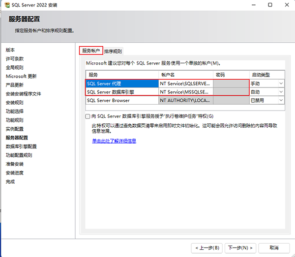 12、服务账户配置,这里可以选择SQL Server代理和引擎的账户,一般保持默认并且安装好后还可以修改;