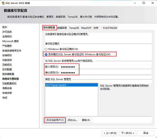14、服务器配置。选择混合模式,设置sa密码(sa是sql server的超级管理员),点击添加当前用户;