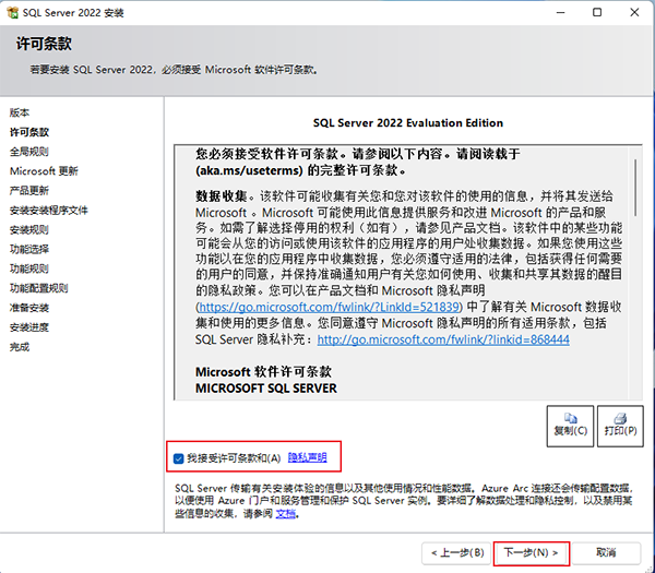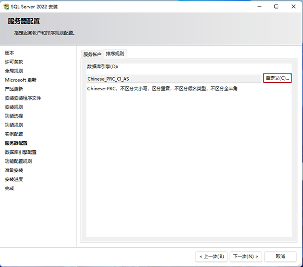 13、排序规则设置,一般保持默认,如需要修改点击自定义,选择指定排序规则(注意:数据库迁移和高可用搭建需保持排序规则一致,排序规则在安装后不易修改),点击下一步;